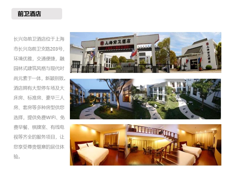 核舟上海團建基地—長興島基地前衛酒店位于上海市長興島前衛支路203號,環境優雅,交通便捷,融園林式建筑風格與現代時尚元素于一體,新穎別致。酒店擁有大型停車場及大床房、標準房、豪華三人房、套房等多種房型供您選擇。