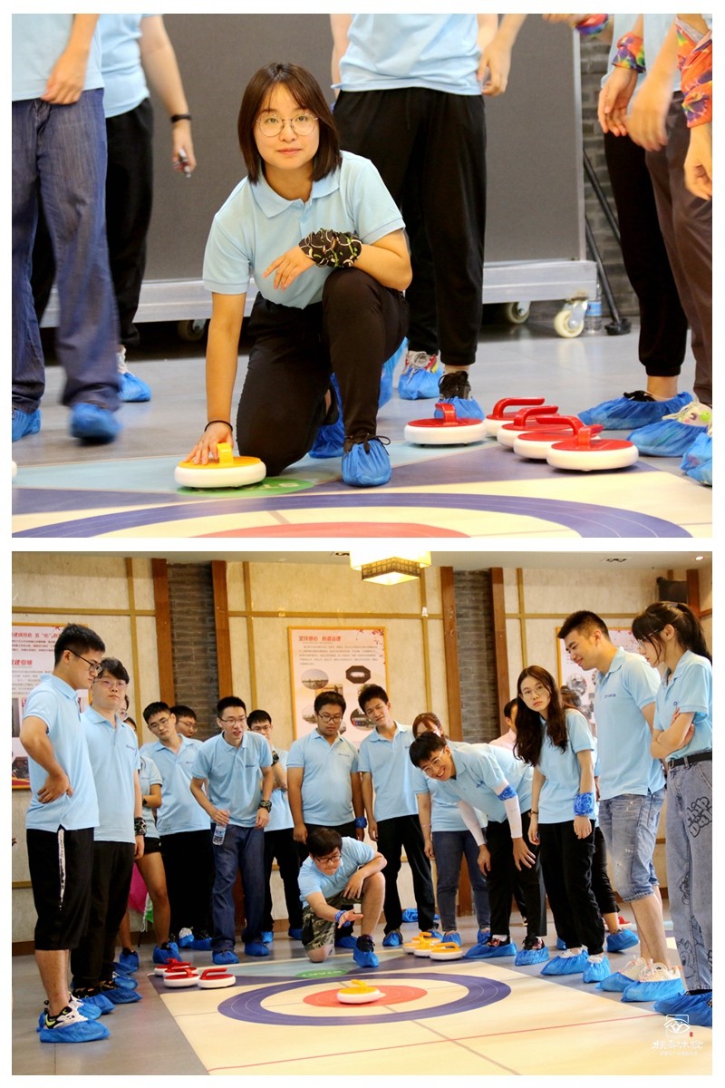 第一天上午,拓展訓練正式開始,在專業教練帶隊下,用小游戲進行了破冰分組,減少了大家之間的陌生感。接著開展了一場旱地冰壺的對決,分成了6個小組,兩兩對決,現場氣氛歡快,歡呼聲連連不斷。