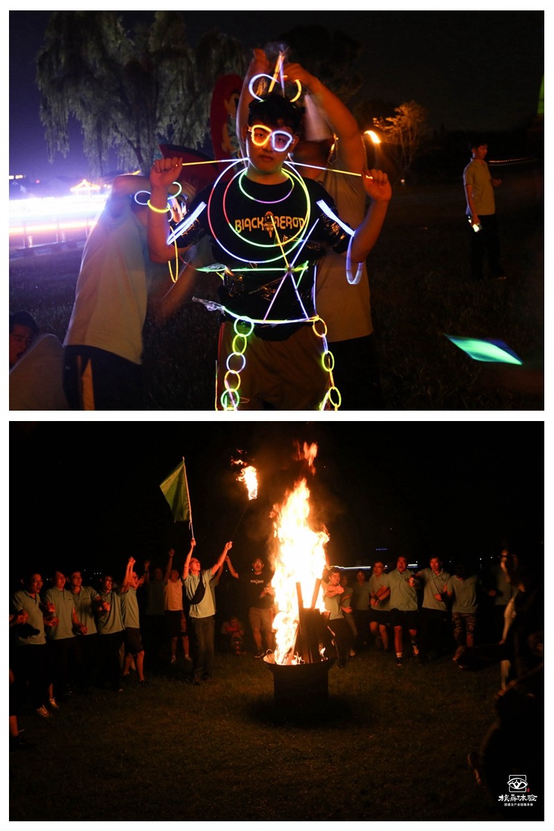 晚上舉行了一場篝火晚會,大家圍繞著篝火盡情歌唱,完全沒有了初見時的拘謹。在熒光棒的襯托下,大家擺出各種各樣的奇葩造型,完全的放飛了自我。
