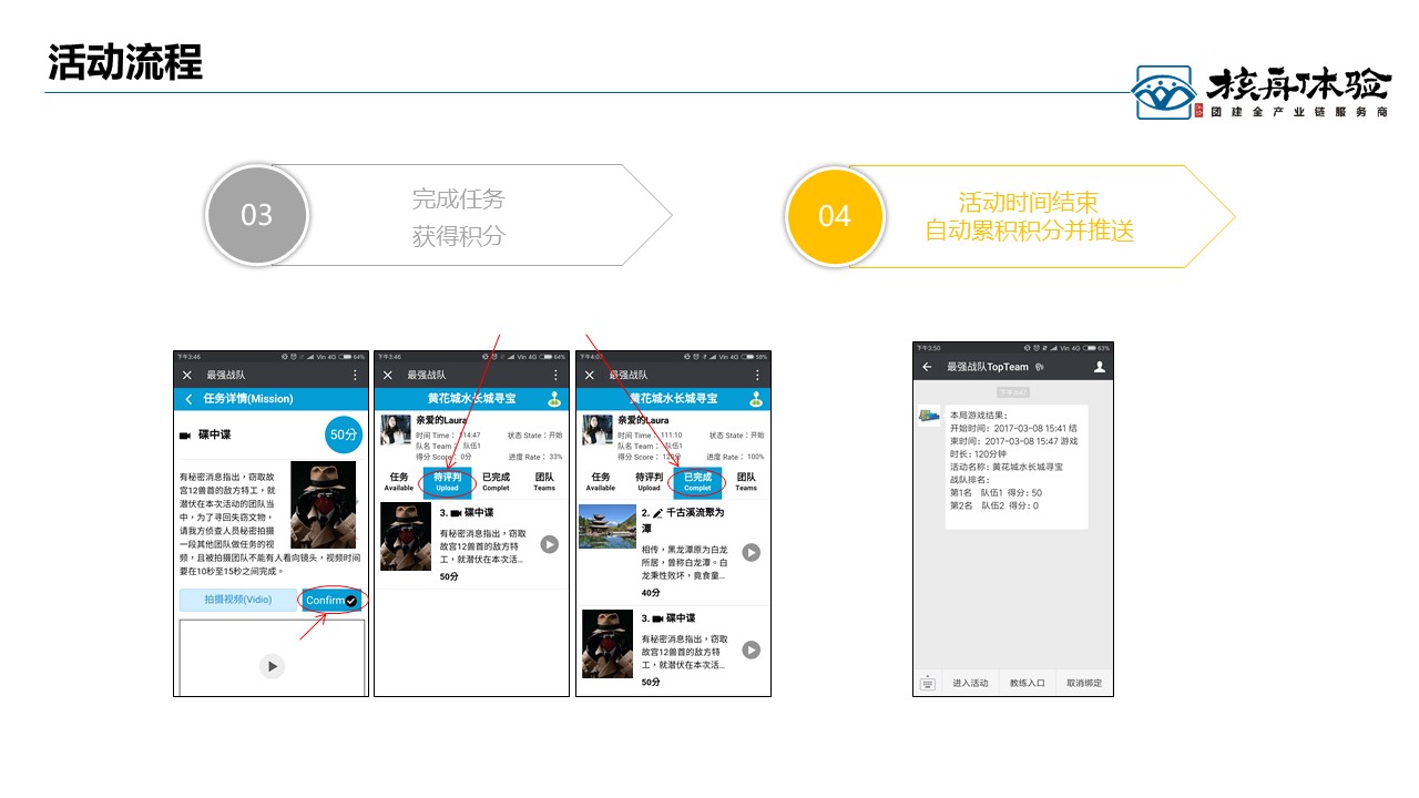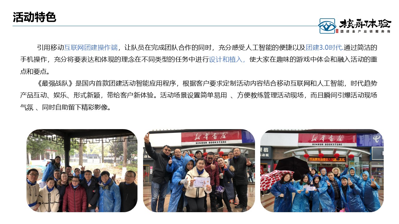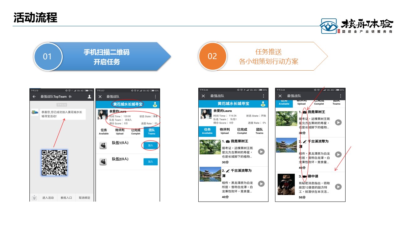 最強戰隊,跑男升級版, 線上線下結合, 時尚有趣有料。活動場景設置簡單易用 、方便教練管理活動現場,而且瞬間引爆活動現場氣氛 、同時自助留下精彩影像。核心玩法:小程序基于景區元素+企業文化+游戲任務多元融合設計,體驗中更加強調以學員為中心的決策與執行