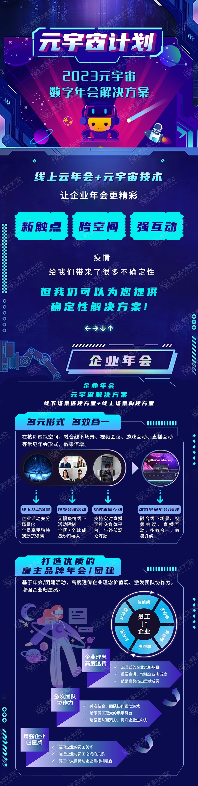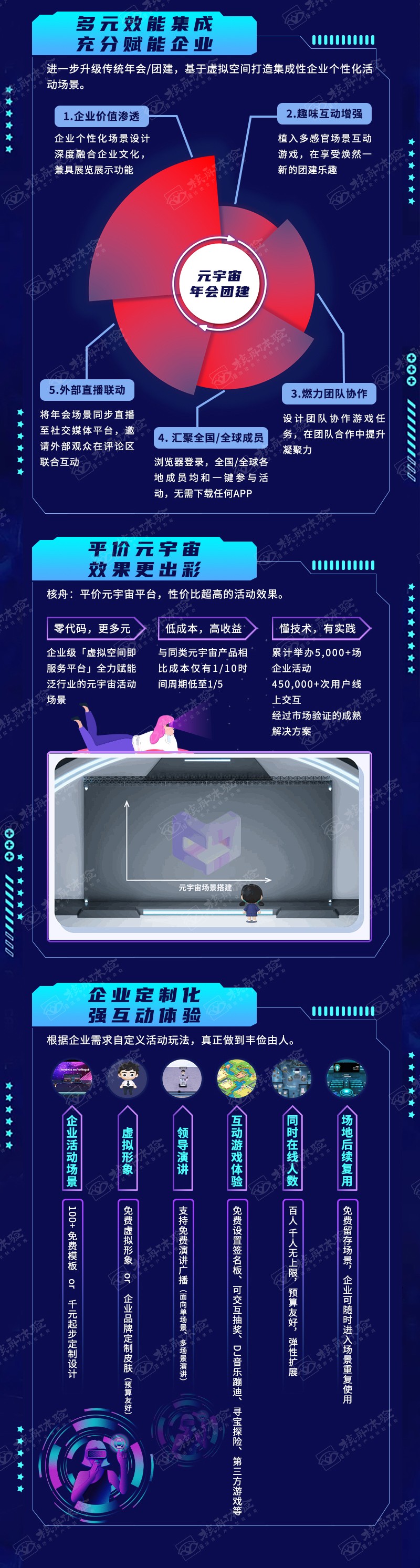 線上云年會+元宇宙技術 讓企業年會更精彩,具有沉浸式,跨空間,強互動的特點,在不確定的時代提供確定性解決方案。核舟虛擬空間,融合線下場景、視頻會議、直播互動等常見年會形式,效果倍增。企業活動充分場景化 全員享受獨特活動沉浸感。無懼疫情線下活動限制 全國/全球成員均可接入。